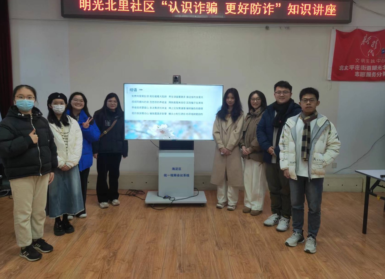 为帮助老年群体认识诈骗,更好防骗,2023年11月30日上午,中央财经大学法律援助协会的李秋婉、刘文怡、刘珈西三位同学来到北京市海淀区明光北里社区服务中心,与中国政法大学研究生法律援助协会、中国人民大学法律援助中心的同学们共同参与和明光北里社区主办的“12.4国家宪法日宣传活动——认识诈骗,更好防骗”知识讲座。