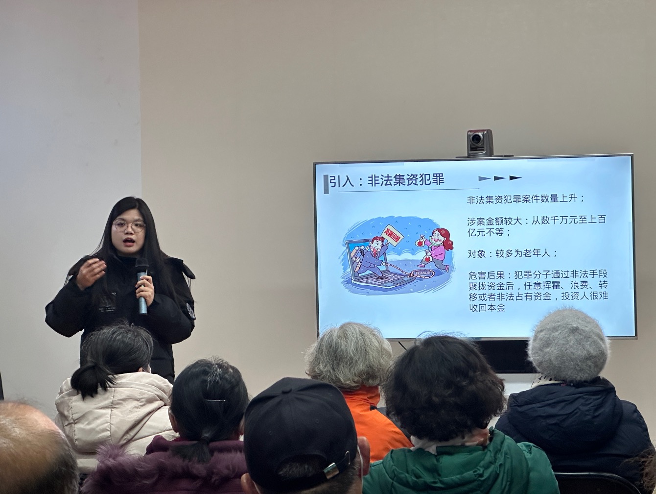 本次防诈知识讲座由我校法律援助协会李秋婉同学主讲,她通过充分地收集、整理相关资料并结合时下新闻报道案例,总结出了目前最常见的四种针对老年人的诈骗手段,分别是非法集资类诈骗、医疗保健品诈骗、收藏古玩类诈骗和电信诈骗。通过对每种类型诈骗的典型特点进行讲解,并配上相关案例,让老年人们更加全面的了解诈骗手段,以便其在日后遇到类似情形时,能够迅速识别出诈骗,从而防止受骗。