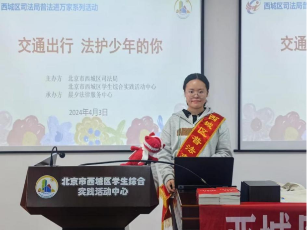 2024年4月3日,在“清明小长假”到来之际我校法律援助协会受邀参与由北京市西城区司法局和西城区学生综合实践活动中心共同主办、晨夕法律服务中心承办的“交通出行,法护少年的你”普法进万家系列活动。我校法律援助协会成员钱鸿羽同学作为本次活动的主讲人,韩俊妍同学与李昂同学作为协助人员,代表我校法律援助协会参加活动。