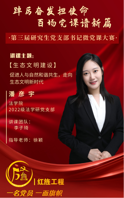 本次微党课大赛旨在引导广大研究生党员深入学习习近平新时代中国特色社会主义思想,深刻阐述中国式现代化的中国特色和本质要求,深切领会并弘扬党的二十大精神,设立经济建设、政治建设、文化建设、社会建设、生态文明建设、教育科技人才、法治建设、国家安全、国防和军队建设、港澳台工作、外交工作、党的建设、英雄模范13个方向,面向全校24个学院(研究院、中心)开展比赛。经初赛评审,我院2022级法学研党支部书记潘彦宇同学顺利晋级,成为进入决赛的15名选手之一。