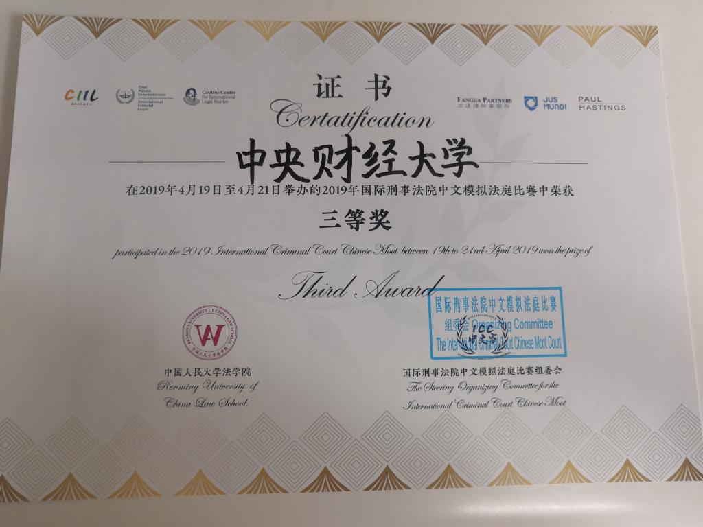 2019年4月20日至21日,2019年国际刑事法院中文模拟法庭比赛在中国人民大学举行。本次大赛由国际法促进中心、中国人民大学法学院主办,由中国人民大学法学院承办。清华大学、复旦大学、东吴大学、上海交通大学等共计59支高校代表队报名参加,经过书状筛选、模拟庭辩的重重考验,中央财经大学代表队获得三等奖。