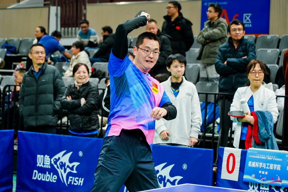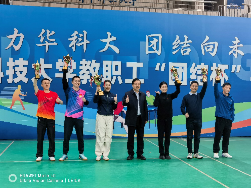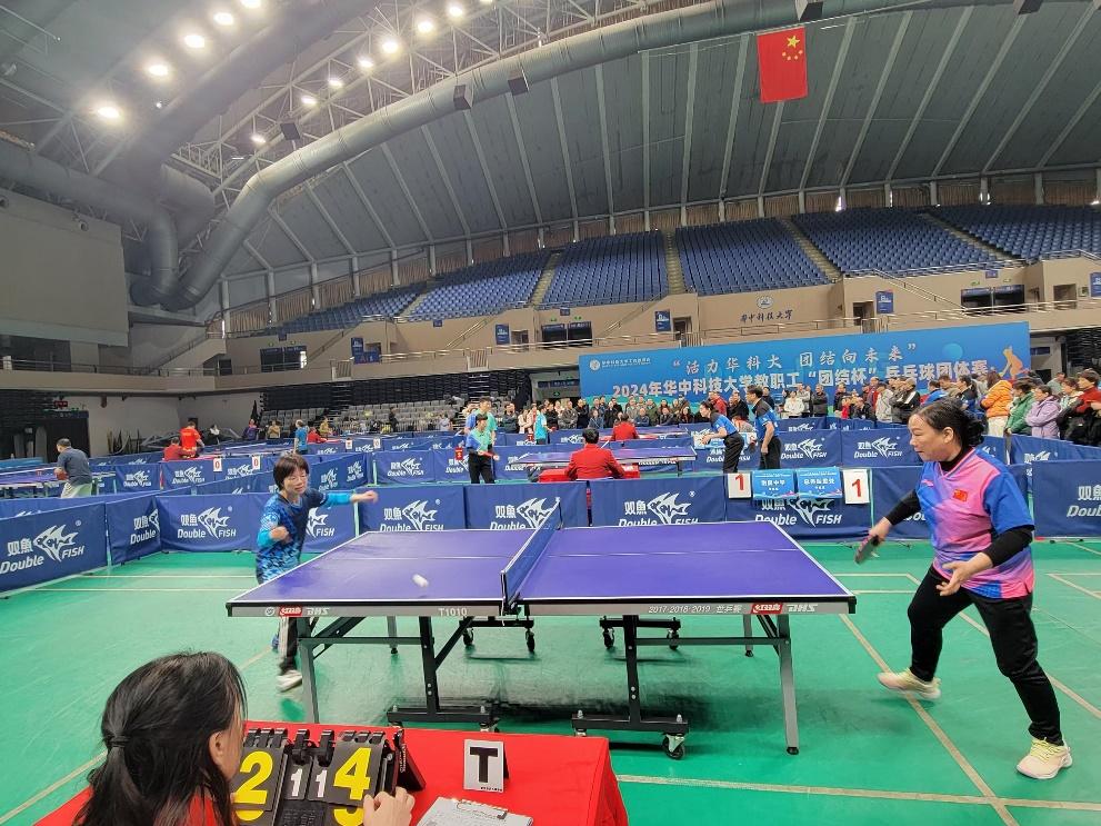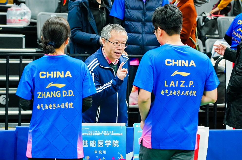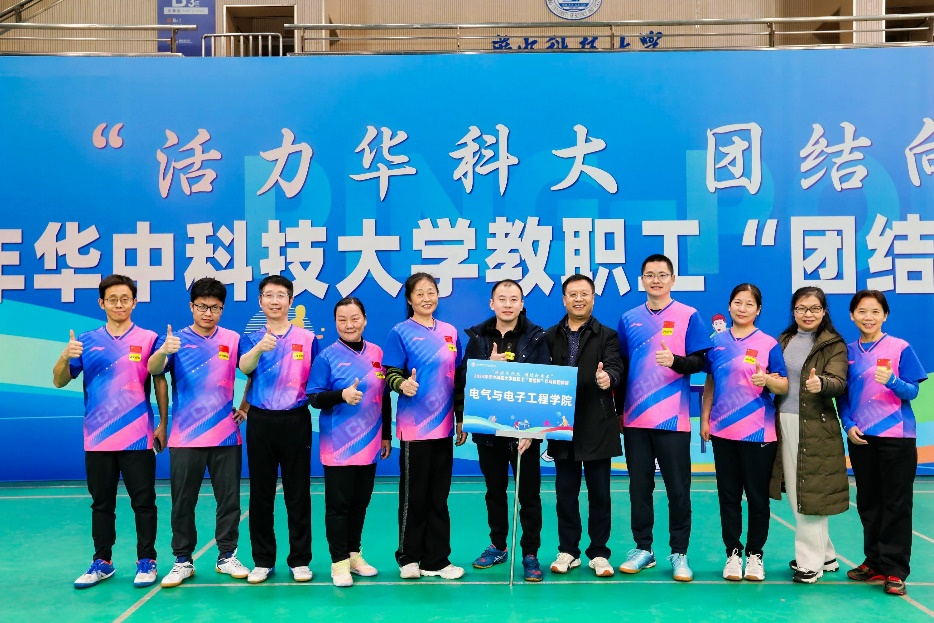 华中科技大学一年一度的教职工团结杯乒乓球团体赛于2024年12月7-8日在光谷体育馆举行。本届比赛高手云集、竞争激烈,汇聚了甲组11个和乙组21个共32个单位,约350名运动员。甲组代表学校乒乓球的较高水平,乙组前两名可升级到甲组,甲组后两名退到乙组,甲组动态调整保持12个单位。经过两天的激烈角逐,电气学院代表队最终喜获甲组第三名,附属协和医院荣获甲组冠军,校机关获得亚军。