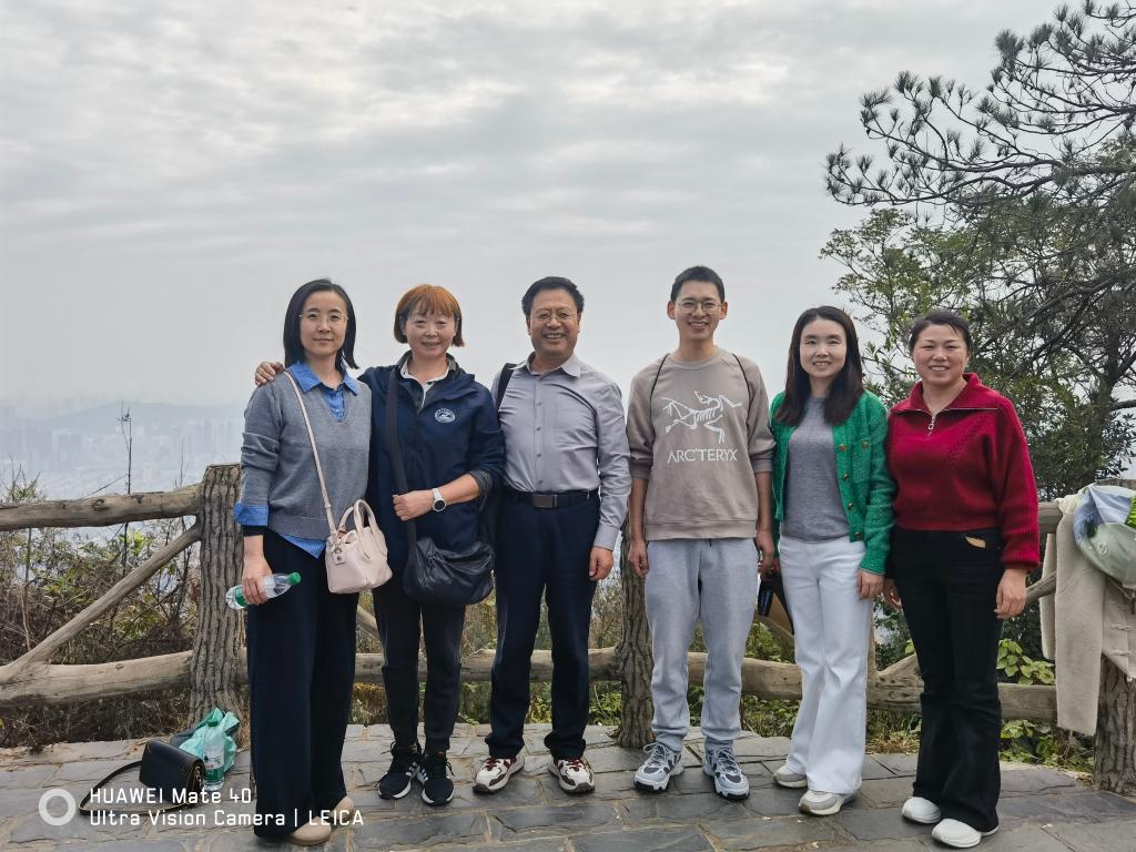 九时许,队伍抵达八分山山麓的依山小院,徒步之旅正式开启。沿石阶上行,秋林疏朗,风携草木清香萦绕身旁。行至陡峭的楼梯步道时,几位老师扶着石阶旁的树干放慢脚步,额角渗出细汗,有老师喘着气笑道“这坡还真有点陡,爬得人腿发酸,但这样才够劲儿,正好给久坐办公室的身体好好松松筋骨!”。爬到八分亭时,远处城区轮廓渐显,汤逊湖波光隐约,大家迅速掏出手机记录,有的以亭为景抓拍微笑,有的拉着同事合影,与秋日山色共画,记录山水美好。继续前行至气象塔附近,视野豁然开朗——江夏城区的红顶民居与远处的山水交织成景,汤逊湖的粼粼波光隐约可见,正如“山有水分流如八字”的得名渊源,眼前的风光尽显八分山的独特韵味。徒步途中,汗水浸湿衣衫,却挡不住大家的热情。“平时伏案工作久了,难得这样亲近自然,登山时一步步向上,感觉心里的浮躁也被慢慢抚平了。”“和同事们一起边走边聊,不仅锻炼了身体,还拉近了彼此的距离,这样的活动太有意义了!”老师们你一言我一语,分享着登山的感悟。十一点半,队伍沿水泥步道返程,虽有疲惫,却个个神采奕奕。