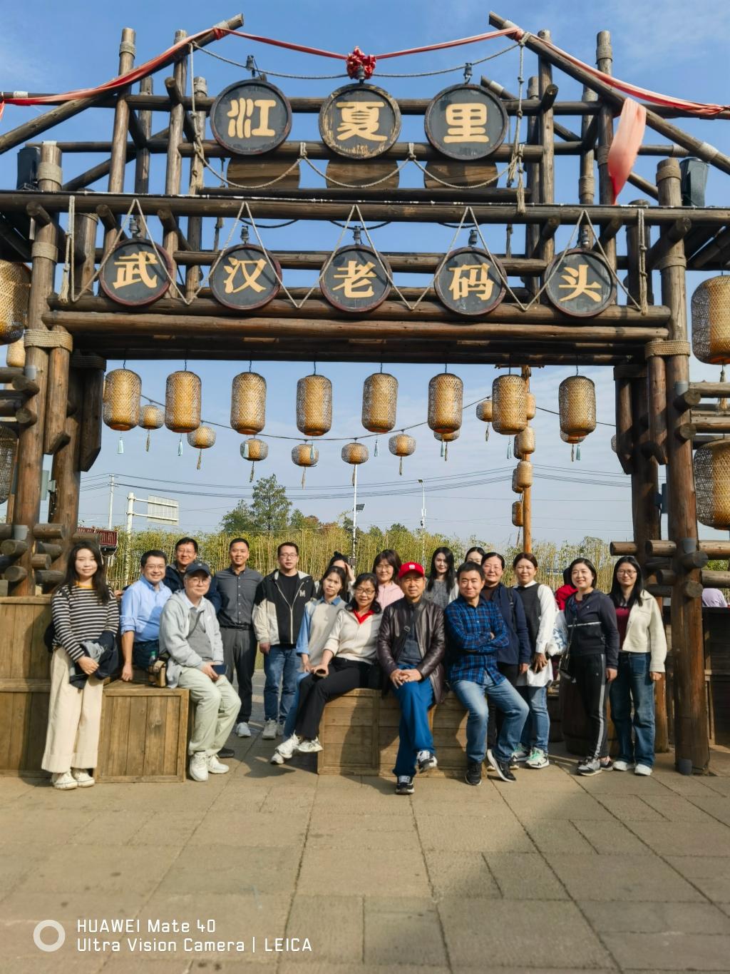 下午一时,大巴车再度启程,历时20分钟抵达文旅新地标——江夏里。一踏入这片浸润着老码头文化的街区,木制拱桥便牵引着众人的脚步,复古招牌在阳光下格外醒目,挂着灯笼的拱桥横跨湖面,宛如“现代版清明上河图”中的景致。大家三三两两自由漫步,或驻足端详“青砖黛瓦马头墙”的明清荆楚建筑群,聆听砖瓦间诉说的光阴故事;或穿行于错落有序的店铺,感受传统市井的生活魅力;还有人在广场茶摊,围坐交流,沉浸式感受老码头文化。在尽兴游览参观之后,教职工们带着满满的收获与不舍集结返程。夕阳的余晖透过车窗,映照在每个人笑意盈盈的脸上。此次秋游虽已落幕,但八分山的清风、江夏里的文脉与同事间的温情,都化作了珍贵的记忆。