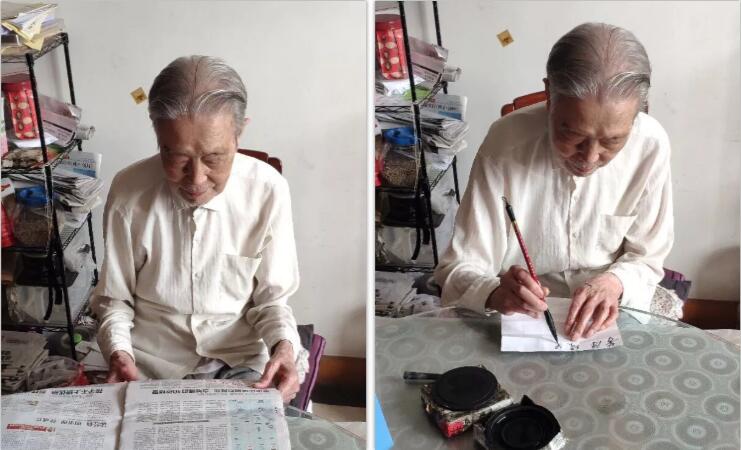 尹家骥老人在看报、写字