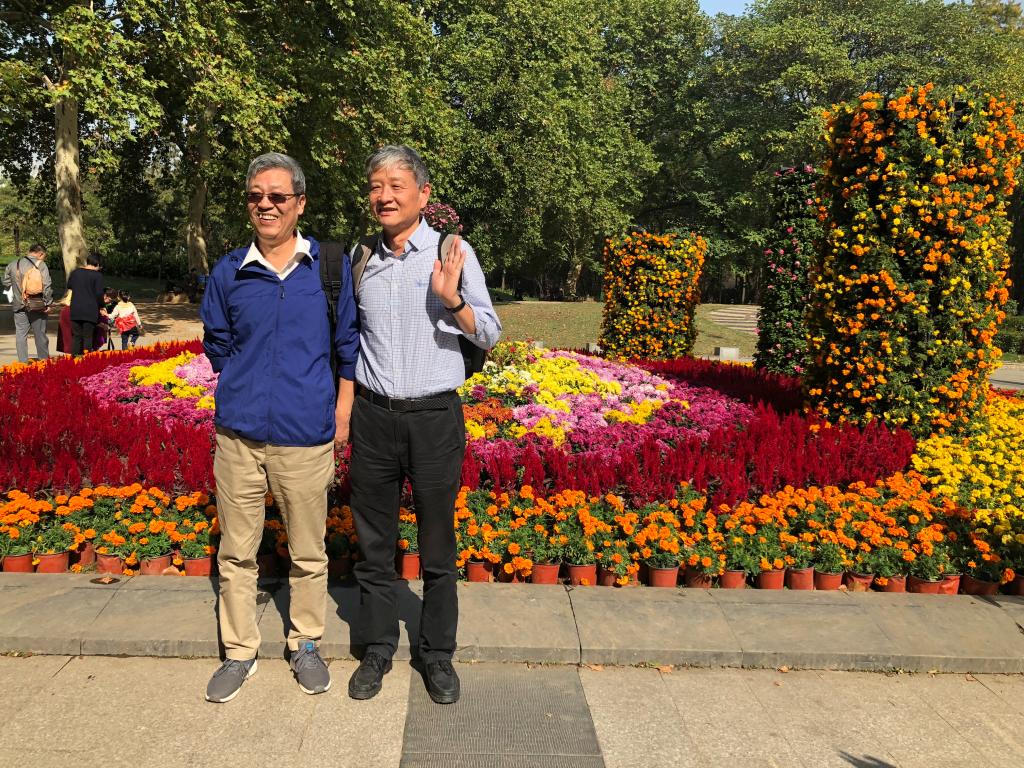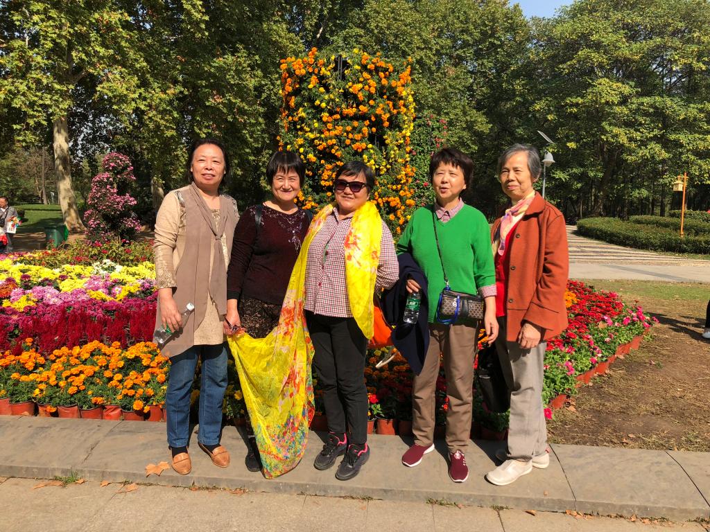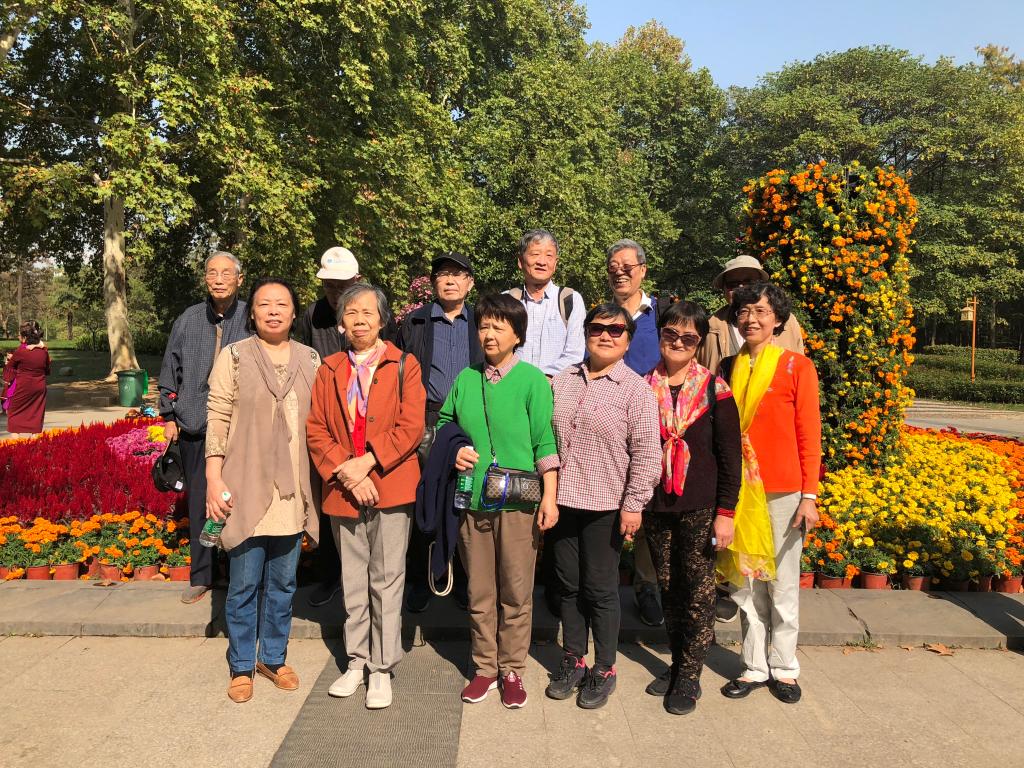 天高云淡,秋风送爽,暖暖的阳光伴我们一路畅行来到解放公园参观武汉市第35届金秋菊展,“喜迎军运,建设美丽武汉” 主题菊花展品种多达60个,其中盘龙卓越、盘龙如意等盘龙系列的菊花都为世界罕见品种。花展灿若云霞,千姿百态,白发一族的我们被这姹紫嫣红,争奇斗艳的菊花陶醉了,尽管不少老师年过80,但个个精神饱满,游性正浓,大家你扶我挽,三五成群结伴而行,相互照应慢步在花的海洋,欢声笑语此起彼伏,我们留下了一张张人与花共舞,花与人同乐的幸福照片。