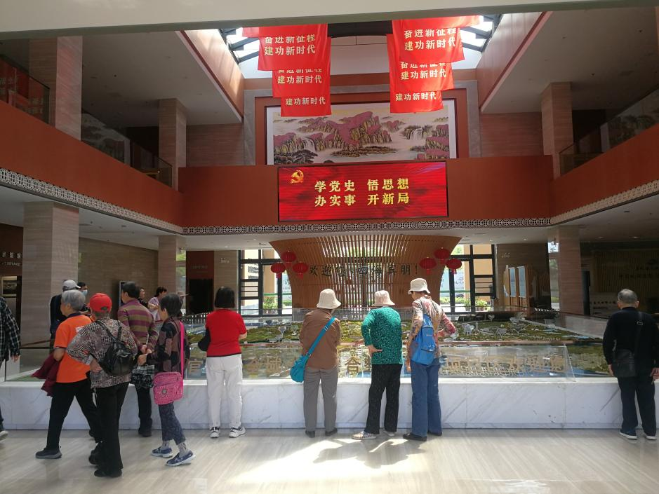 大巴车缓缓绕官桥八组的建筑群行驶,一排排雅致的两层别墅红砖黛瓦在树林中若隐若现,大家羡慕的赞美着八组居民安居乐业的幸福的生活。走进“田野农博馆”展厅,红色的氛围震撼着大家,大家或在家乡巨变的景观盘旁指指点点观看,或沿着展览厅仔细看着图片和说明,时不时用手机拍摄着岁月沧桑,山乡巨变的历史画面,有的老师驻足认真观看着官桥八组变迁的视频,有的老师自觉围坐在一起阅读官桥八组的艰苦奋斗史,有的在议论着官桥八组昨天的故事今天的幸福和明天愿景,大家深切感受到了党的十八大以来,国家大力支持、鼓励创新,为广大新农村建设创造了特别好的外部环境。