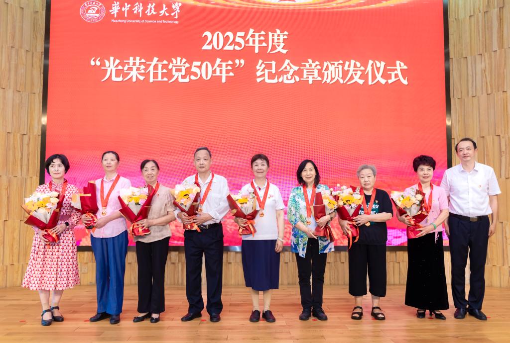 2025年6月25日上午,华中科技大学2025“光荣在党50年”纪念章颁发仪式在梧桐雨明德报告厅隆重举行,校党委书记张广军、党委副书记张涛、校党委组织部部长顾远飞等出席活动。党委副书记张涛为老党员们颁发纪念章。电气学院余调琴、张光芬两位同志作为党龄满50年的党员,光荣获颁纪念章。