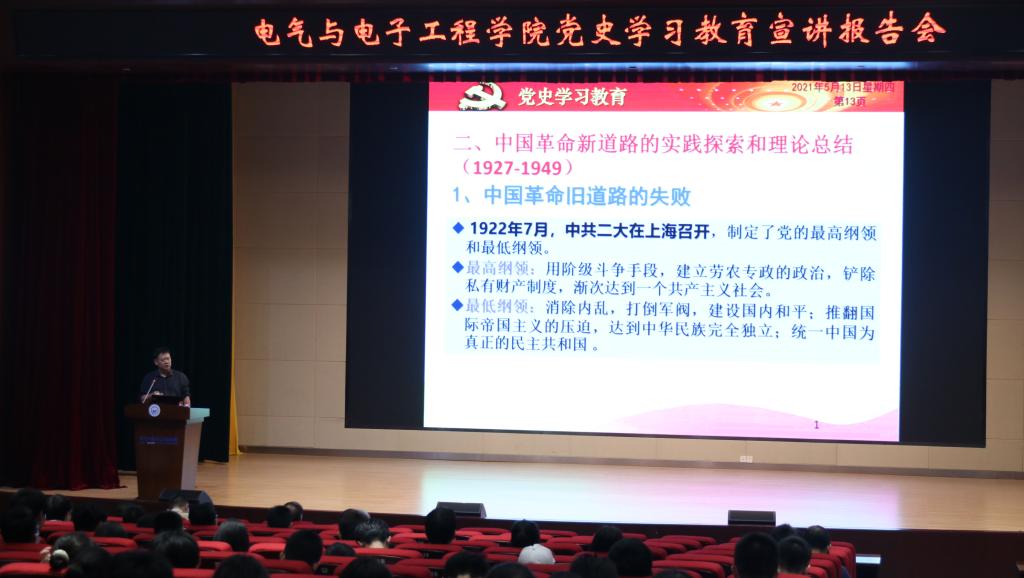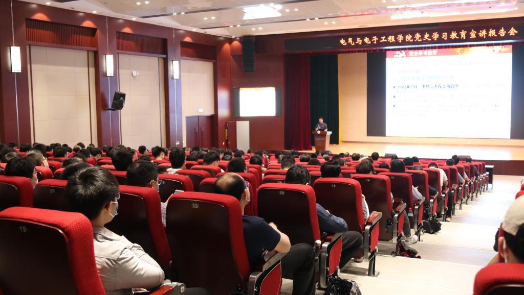 5月12日下午,电气与电子工程学院党史学习教育宣讲报告会在电气与电子工程学院报告厅B205举行。学院全院教职工、博士后、退休老同志代表、学生代表338人到会听讲。本次报告会由我校马克思主义学院张德鹏教授主讲,宣讲题目是《百年初心,使命传承》——中国共产党百年实践探索与理论创新征程回眸。