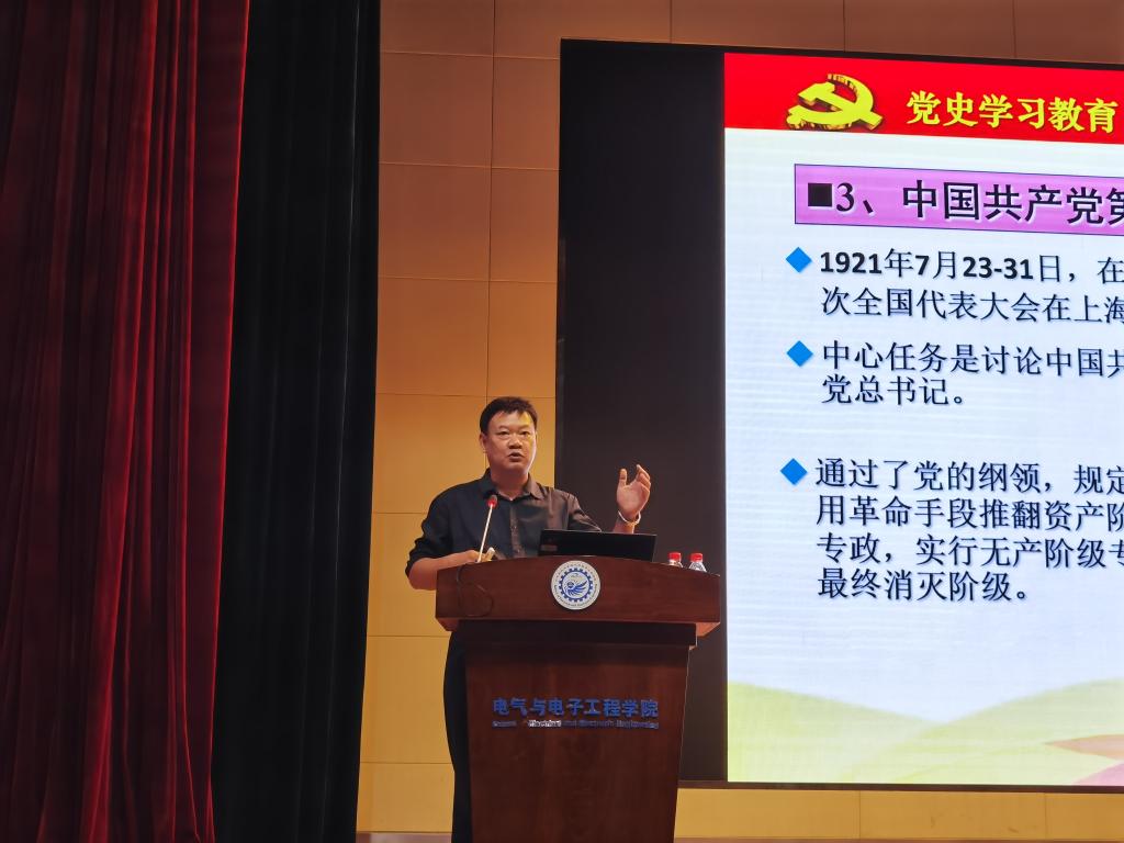 电气学院副院长兼纪委书记张明主持。张明指出,开展党史学习教育是党中央部署、学校党委安排的一项重要的政治任务,是2021年党建和思想政治工作的重要内容,希望全体师生认真听讲,积极思考,有所收获,通过学习深刻铭记中国共产党百年奋斗的光辉历程,深刻认识中国共产党为国家和民族作出的伟大贡献,深刻感悟中国共产党始终不渝为人民的初心宗旨,系统掌握中国共产党推进马克思主义中国化形成的重大理论成果,学习传承中国共产党在长期奋斗中铸就的伟大精神。