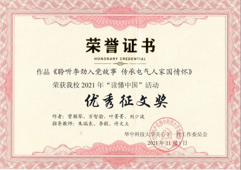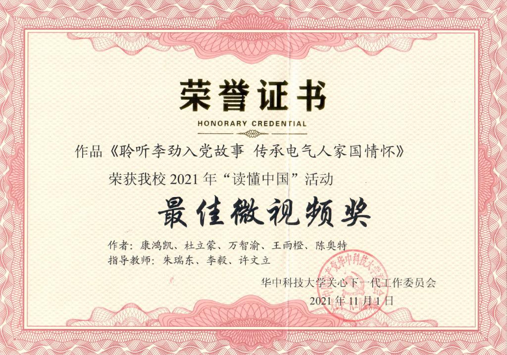 2021年11月1日,华中科技大学关工委在老年活动中心举行“讲好入党故事——传承红色基因”——2021年“读懂中国”活动颁奖仪式暨作品展演。电气博士2002班党支部作品《聆听李劲入党故事,传承电气人家国情怀》荣获“最佳微视频奖”(作者:康鸿凯、杜立蒙、万智渝、王雨橙、陈奥特,指导教师:朱瑞东、李毅、许文立)和“优秀征文奖”(作者:曾颖琴、万智渝、叶菁菁、刘少波,指导教师:朱瑞东、李毅、许文立)。电气与电子工程学院荣获“优秀组织奖”。
